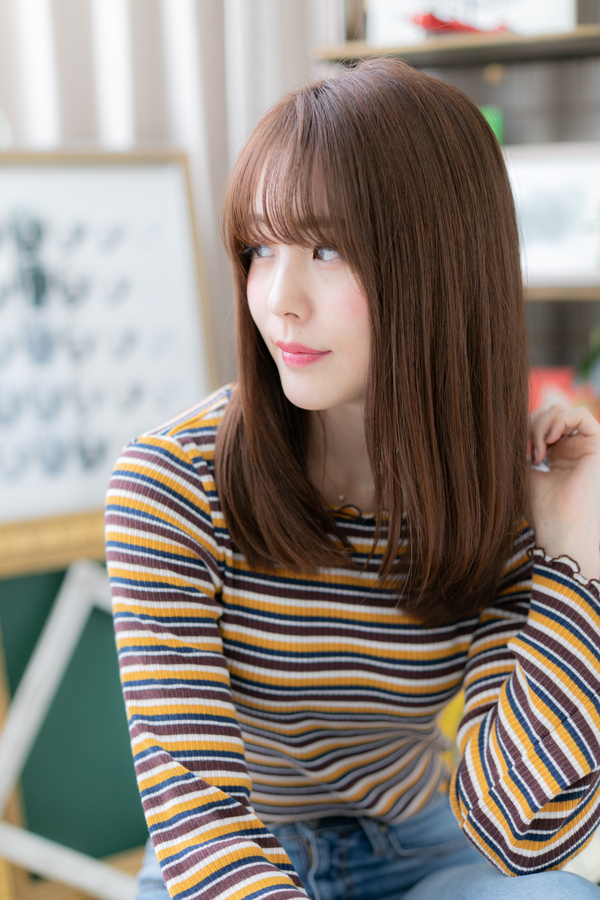 重めスタイルはインナーカラー,グラデーションやベージュの暗めの髪の色で外国人風グラマラス感を。ツヤと透明感で軽やかな清潔感を演出し大人女子のファッション度UPで好感度大のヘアスタイルに。40代のエラ張り対策にもおすすめ!(メイク担当:COVERHAIRGROUP 中田)