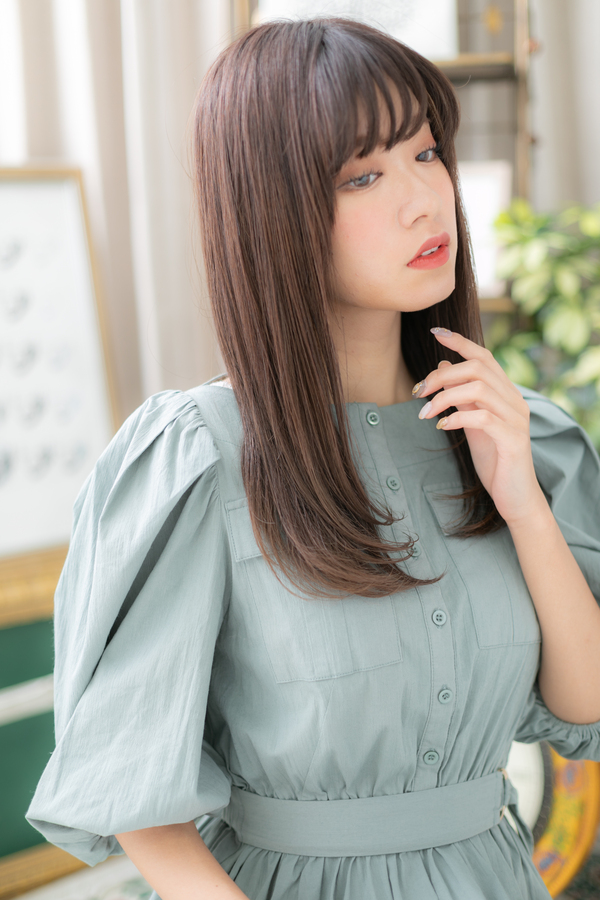 シースルーバングや斜めバングで目元を印象付けたフェミニンロング。ピンク系のカラーでツヤと透明感を出し、レイヤーで軽さを演出。前下がりで小顔に仕上げて美人顔で大人女子のファッション度UPのヘアスタイルです。40代のエラ張り対策にもおすすめ!