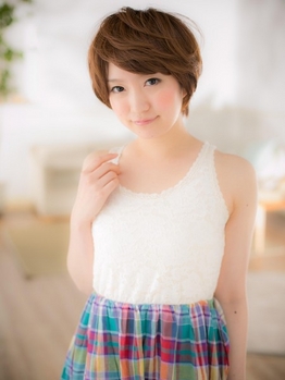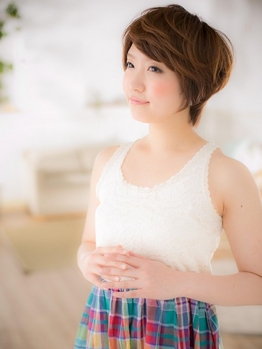 斜めのふんわり前髪で、小顔効果抜群の、ナチュラルで透明感あふれるショートスタイル。どんな顔型でも似合いやすいスタイルなので、これまでショートにチャレンジできなかった人にもオススメですよ!