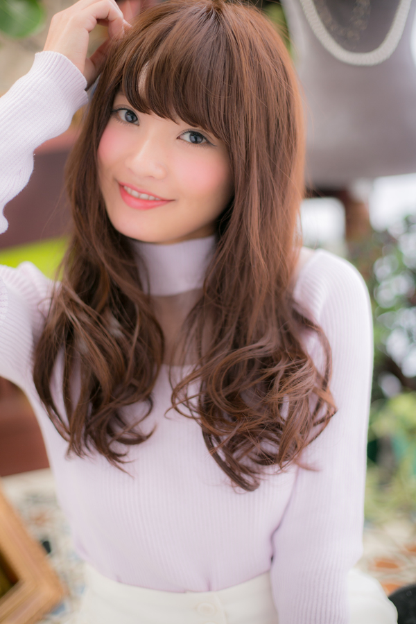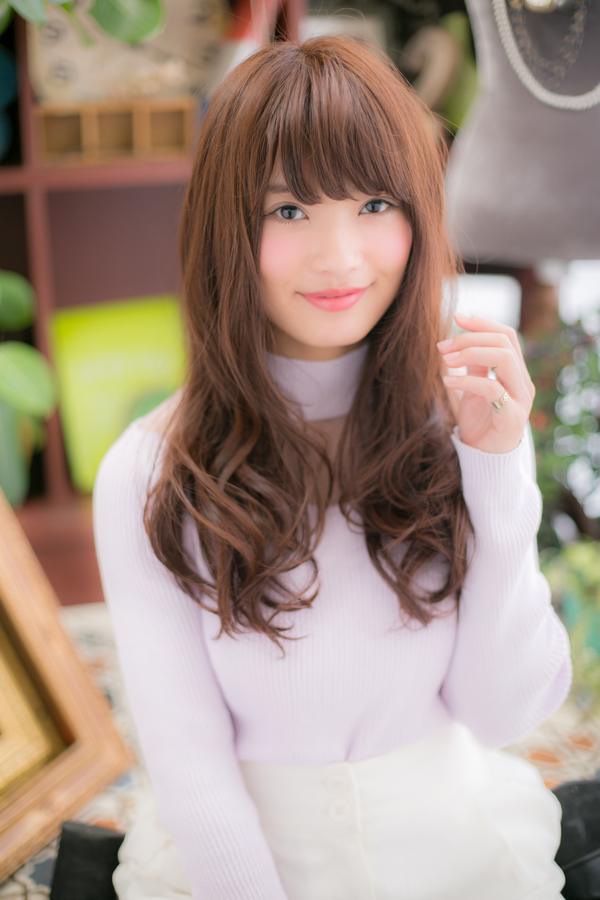 前髪はラウンドさせつつサイドにつなげているので、顔周りにシャギー感が出て軽快な印象に。ロングスタイルでも重くなく、明るい華やかな印象に。パッツンバングが伸びてきたら、サイドに流して、大人っぽい斜めバングにしても素敵☆アップにしても抜け感が◎