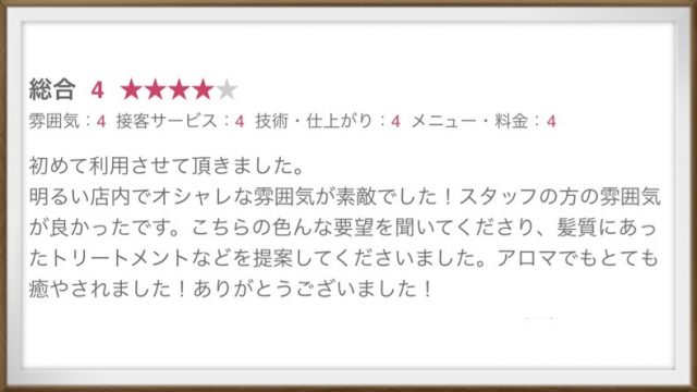 明るい店内でオシャレな雰囲気が素敵でした!スタッフの方の雰囲気が良かったです。こちらの色んな要望を聞いてくださり、髪質にあったトリートメントなどを提案してくださいました。アロマでもとても癒やされました!ありがとうございました