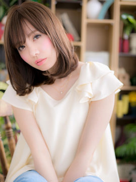 肌質良く見える♪透明感あるベージュカラーとシンプルなボブデイスタイルに目にかかる位のうざバングや斜めバングでフェミニンさもプラス。旬のメルトカラーやグラデーションカラーでカジュアルにキメてもおしゃれ♪