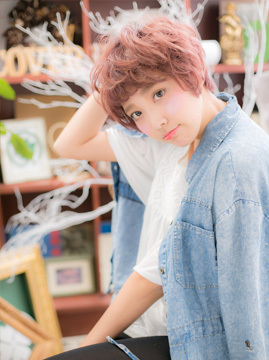ふんわりカールに可愛いピンク系のカラーで一気にカジュアルに☆眉上バングがより個性をUPさせます。カールが柔らかいので奇抜過ぎずナチュラルなオシャレスタイルに。