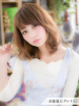明るいベージュ系カラーとアンニュイカールでガーリースタイルに。伸ばしかけや直毛の方にオススメです。厚めバングが小顔効果もUPさせます。くびれミディやくせ毛風カールが気になる方も色々ご提案します☆