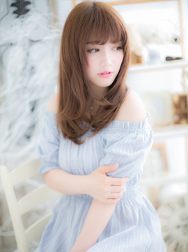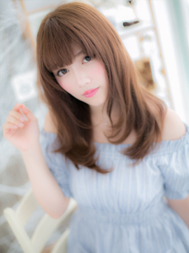 明るいオレンジベージュカラーが重めスタイルも重く見せません。厚めバングが小顔効果もUPさせるのも嬉しいポイント♪マーメイドアッシュやイノセントカラーもオススメです。直毛の方はアンニュイカールで柔らかみを。