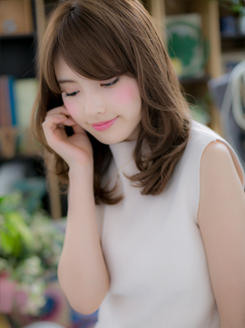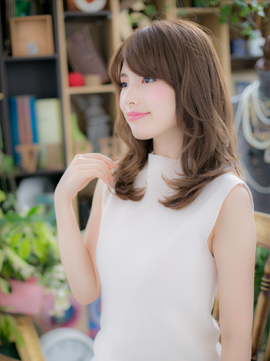 斜めバングとゆるふわなアンニュイカールで抜け感ある優しい雰囲気に。ベージュカラーやイノセントカラーで大人っぽく落ち着いた印象になります。大人かわいいセミディはオフィスでもデートでも好印象なモテ髪です☆