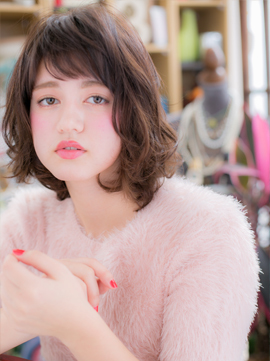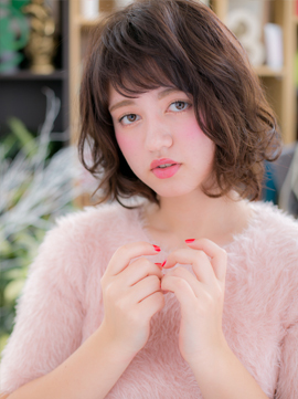頬にかかるカールがやわらかな印象を醸すフェミニンボブ。高めの位置からパーマをかけることで、軽くてエアリーなゆるふわ感を演出。少し短めの斜めバングでカジュアルダウンして、ガーリーな妹系の愛され顔に☆