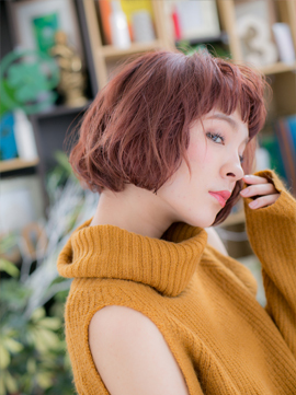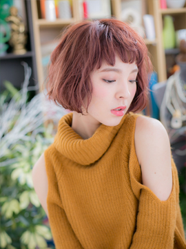 眉見せショートバングがちょっぴりレトロで大人かわいいエアリーボブ。周囲と差のつくスポンテニアスなレッド系カラーで個性的な仕上がりに。表情を明るくするだけでなく、美白に見せてくれますよ。耳かけもキュート☆