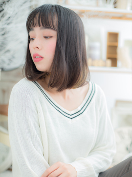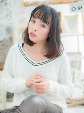 フリンジバングのワンカールミディ。表情をチラ見せする透け感前髪でガーリーに見せます。ポイントはサイドのインナーカラー。ハイトーンにすることで、ノームコアなスタイルが一気に個性的なスポンテニアススタイルに!