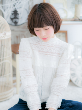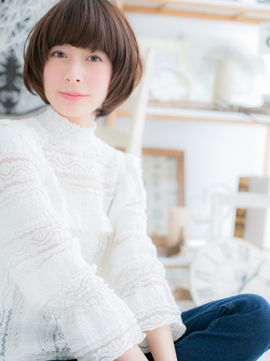 ワンカールの丸みあるフォルムがキュートで個性的なラブガーリーボブ。ツヤカラーでさわやかな好感スタイルに。耳横にボリュームを持たせて小顔に見せて。厚めバングで目力UP!(メイク担当:COVER HAIR GROUP 棟方)