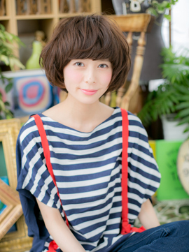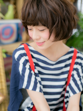 ノームコアなナチュラルボブにくせ毛風のエアリーカール。自然なゆるウェーブのベビーショートでフェミニンに。厚めバングと合わせて目元upキュートな小顔に(ヘアスタイル担当:川口店 成田 メイク担当:北浦和店 棟方)