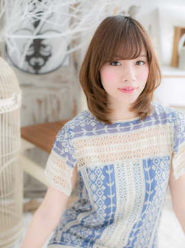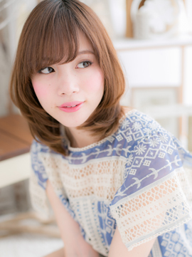 ふんわりレイヤーとベージュカラーで、ノームコアなナチュラルミディにやわらかさをプラス。女性らしい丸みシルエットとフリンジバングでガーリーなスイートミディに。小顔効果も◎(メイク担当:COVER HAIR GROUP 成田)