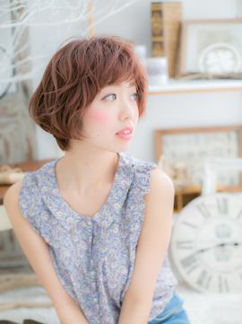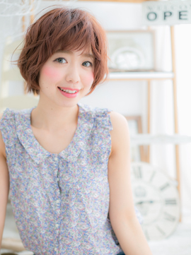 パッと目を引く明るいカラーとふわふわウェーブでcuteに仕上げたベビーショート。トップを立ち上げて小顔に見せ、スタイルUP効果も狙って。くせ毛みたいなくしゅっと感で愛され顔に♪(メイク担当:COVER HAIR GROUP 成田)
