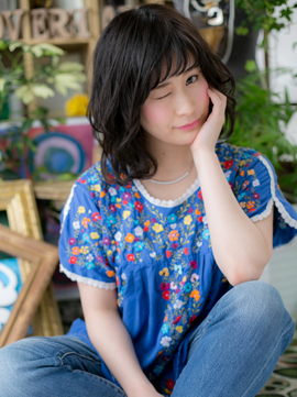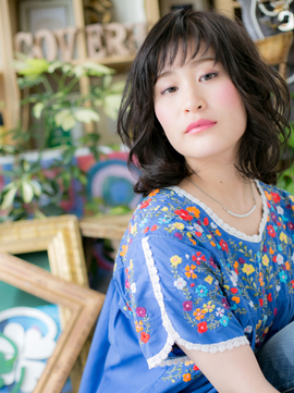 透け感あるフリンジバングと顔周りで揺らめくエアリーカールで軽やかに。黒髪でも重めスタイルにならず、大人かわいい仕上がりに。知的なハンサムミディはオフィスウケもバッチリです!(メイク担当:北浦和店 近藤)