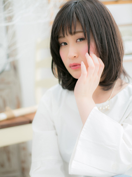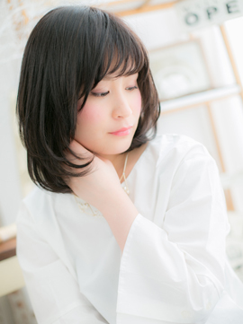 毛先を丸めた黒髪ワンカール。しっとり重めスタイルで上品に仕上げれば上司ウケもバッチリ!透明感あるツヤカラーで重くなりすぎず、ピュアなイノセントガールに。耳かけも可愛い♪(メイク担当:COVER HAIR GROUP 棟方)