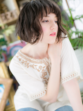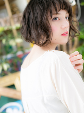 表面にレイヤーを入れて軽さと抜け感を出したニュアンスボブ。くせ毛風のエアリーカールでやわらかな雰囲気に。洗いっぱなしのようなラフな質感でリラクシーに仕上げて。透け感バングも◎(メイク担当:北浦和店 近藤)