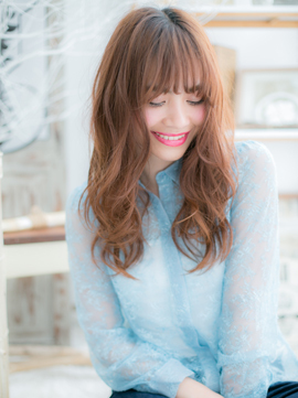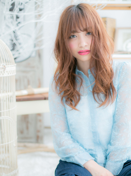 パッと目を引く明るいピンクベージュやオレンジベージュのスパイシーロング。派手な印象になりがちなグラマラスロングは、ダレ落ちウェーブで抜け感を出して、ラフで無造作な仕上がりに。ワンサイドに流してもsexy♪