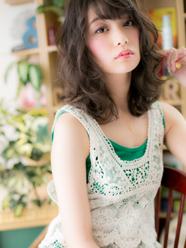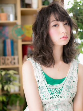 黒髪&ボリュームカールでグラマラスに仕上げたラフミディ。重く見えがちな黒髪は、似合わせカットとパーマで動きを出せば、ふんわり軽くやわらかに。ピュアな雰囲気の中に凛とした空気を漂わせて、大人かわいい印象に。