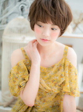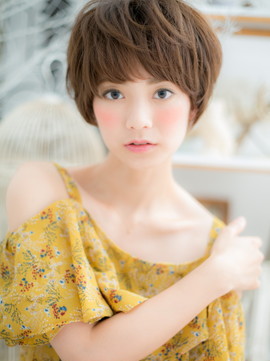 ふくらみを持たせたバルーンシルエットは、暖色系カラーでしっとりとしたツヤを引き出すのがポイント。健康的でグラマラスなフェミニンショートに格上げ。長めのワイドバングで目力強調して☆(メイク担当:川口店 成田)