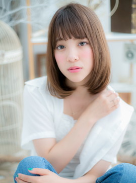 頬を包み込むワンカールストレート&透明感溢れるツヤカラーで、好感度抜群のモテヘアに♪シースルーバングで表情をチラ見せして、甘え顔のあどけない雰囲気に♪デートでも女子会でも人気!(メイク担当:川口店 成田)