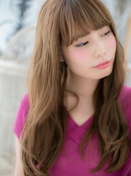 アンニュイ顔を作るエアリーカールのフェミニンロング。斜めバングや厚めバングで目力UP!前下がりラインで小顔に見せて美人顔に♪大人かわいい耳かけやワンサイドで抜け感を出しても◎(メイク担当:北浦和店 棟方)