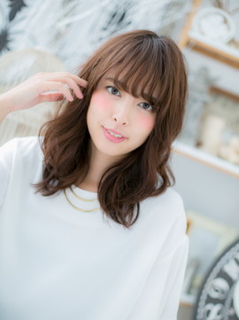 Aラインシルエットで小顔に見せたくせ毛風カールのふわミディ。暗髪の重めスタイルでも、透け感ある斜めバングで空気感と軽さを出して重軽MIXに。前下がりや耳かけも大人かわいい♪(メイク担当:北浦和店 棟方)