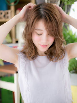 透け感ある斜めバングで表情をチラ見せした、色っぽかわいいふわミディ。厚めバングやワイドバングで個性的にしたり、耳かけも大人かわいい。くせ毛風カールのふわミディでモテ髪に♪(メイク担当:北浦和店 近藤)