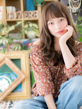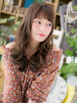 目元に印象を残す斜バングや厚めバングが大人かわいい♪愛されラブロング。くせ毛風カールと耳かけでガーリーにしたり、ワンサイドで抜け感を出してもOK。前下がりラインで小顔メイク♪(メイク担当:北浦和店 棟方)