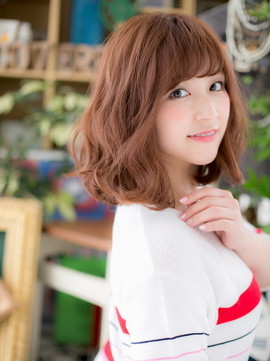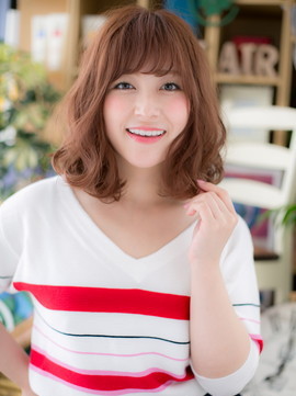 斜めバング&厚めバングで目力強調!女子力UPの大人かわいいふわミディは、くせ毛風カールでふんわりやわらかに仕上げて。耳かけや小顔に見せる前下がりもOK。上目遣いが似合います♪(メイク担当:北浦和店 近藤)