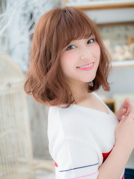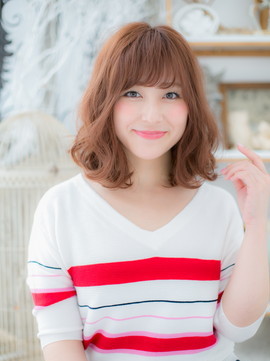 斜めバング&厚めバングで目力強調!女子力UPの大人かわいいふわミディは、くせ毛風カールでふんわりやわらかに仕上げて。耳かけや小顔に見せる前下がりもOK。上目遣いが似合います♪(メイク担当:北浦和店 近藤)