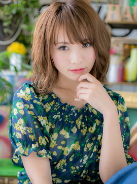 斜めバングとくせ毛風カールでラブカジュアルに仕上げたふわミディ。前下がりで小顔に見せ、目の上ギリギリの透け感バングで目力強調!女子力UPの美人顔に♪厚めバングや耳かけでガーリーにしても大人かわいいモテ髪☆