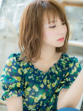 斜めバングとくせ毛風カールでラブカジュアルに仕上げたふわミディ。前下がりで小顔に見せ、目の上ギリギリの透け感バングで目力強調!女子力UPの美人顔に♪厚めバングや耳かけでガーリーにしても大人かわいいモテ髪☆