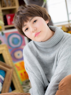 前下がりで小顔に見せて、斜めバングで目力UP!くせ毛風カールでガーリーにして、ボーイッシュショートを大人かわいい雰囲気に。厚めバングや耳かけでアシンメトリーもオシャレ感UP。(メイク担当:COVER HAIR GROUP成田)