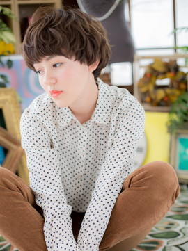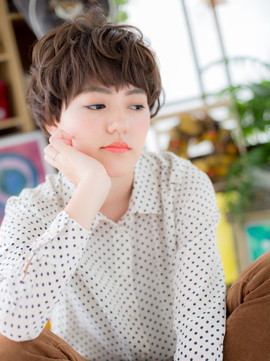 外国の子供のようなくしゃっとくせ毛風エアリーショート。厚めバングと合わせて小顔見せ&目力UP。ラフショートは無造作なかきあげや斜めバングでフェミニンにしても大人かわいい。(メイク担当:COVER HAIR GROUP成田)