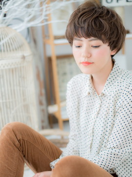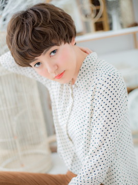 外国の子供のようなくしゃっとくせ毛風エアリーショート。厚めバングと合わせて小顔見せ&目力UP。ラフショートは無造作なかきあげや斜めバングでフェミニンにしても大人かわいい。(メイク担当:COVER HAIR GROUP成田)