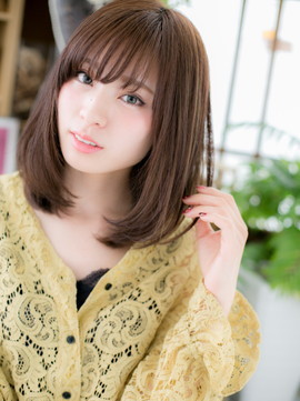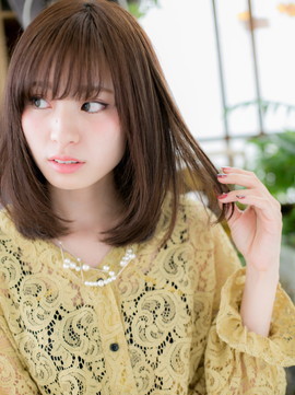輪郭をカバーして小顔に見せる前下がりのワンカール&目力強調の斜めバングで美人度UP!透明感あるツヤカラーで好感度バッチリ。厚めバングやくせ毛風カールのふわミディもガーリー。(メイク担当:COVER HAIR GROUP棟方)