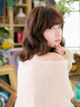 目の上ギリギリの斜めバングで目力UP。サイドの前下がりラインで輪郭カバーして小顔に。くせ毛風カールが大人かわいいふわミディは耳かけや厚めバングもGOOD。甘え顔に仕上げます♪(メイク担当:COVER HAIR GROUP棟方)
