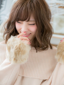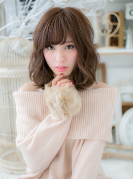 目の上ギリギリの斜めバングで目力UP。サイドの前下がりラインで輪郭カバーして小顔に。くせ毛風カールが大人かわいいふわミディは耳かけや厚めバングもGOOD。甘え顔に仕上げます♪(メイク担当:COVER HAIR GROUP棟方)