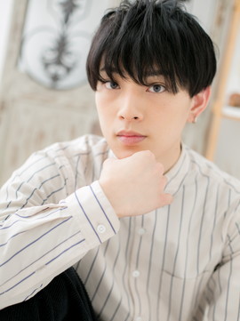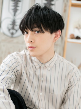 長めバングで目元を印象つけて目力UP。束感を作ってニュアンス感ある動きを出しているので、黒髪でも重めスタイルになりません。多毛の方は刈り上げやツーブロックで毛量調節を。(メイク担当:川口店 成田)