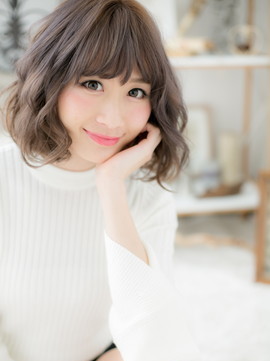 くせ毛風ランダムカールでボリュームを持たせて小顔見せ。斜めバング&厚めバングで目力強調。大人かわいいが詰まったラブふわミディは、耳かけしたりラフな抜け感ヘアアレンジもGOOD。(メイク担当:川口店 成田)