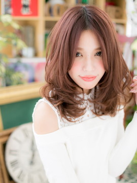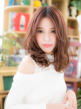 レッド系カラーとセンターパートで個性的に仕上げたグラマラスセミディ。ノーバングでスッキリと、前下がりの毛流れで輪郭カバーして小顔にメイク。斜めバングや厚めバングもフェミニン。(メイク担当:北浦和店 棟方)