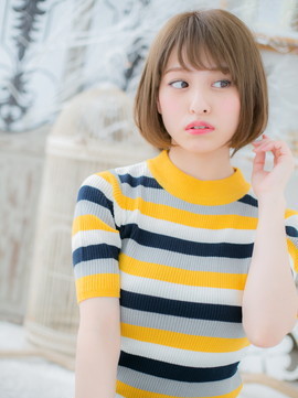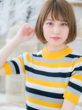 シンプルイズベスト!のナチュラルボブは、明るいベージュカラーでラブカジュアルな雰囲気に。大人ボブやフェミニンボブ、前下がりボブからのイメチェンにもオススメです。斜めバングや厚めバングで目力UPしてモテ顔に☆
