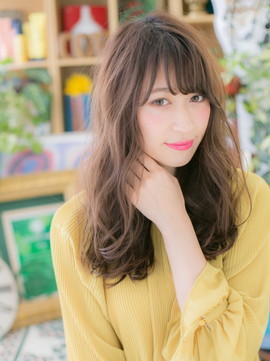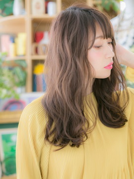 リラクシーな抜け感漂う外国人風ロング。くせ毛風のゆるやかな縦ラインで小顔に見せます。斜めバングや厚めバングで目力強調。ふわミディからの伸ばしかけにGOOD。前下がりも大人クール。(メイク担当:川口店 成田)
