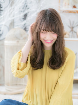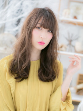 リラクシーな抜け感漂う外国人風ロング。くせ毛風のゆるやかな縦ラインで小顔に見せます。斜めバングや厚めバングで目力強調。ふわミディからの伸ばしかけにGOOD。前下がりも大人クール。(メイク担当:川口店 成田)