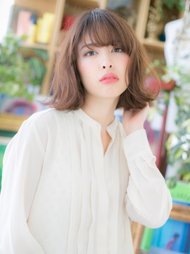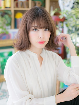 透け感バングの色っぽふわミディ。耳かけも大人かわいい。ナチュラルボブや大人ボブ、前下がりボブやフェミニンボブからのイメチェンにオススメ。斜めバングや厚めバングで目元の印象UP!(メイク担当:川口店 成田)