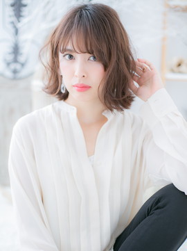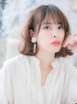 透け感バングの色っぽふわミディ。耳かけも大人かわいい。ナチュラルボブや大人ボブ、前下がりボブやフェミニンボブからのイメチェンにオススメ。斜めバングや厚めバングで目元の印象UP!(メイク担当:川口店 成田)