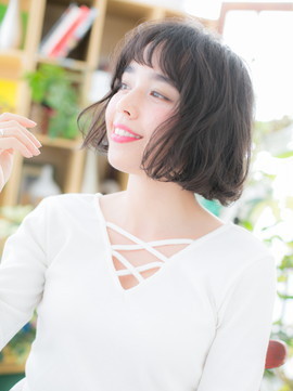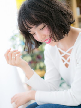 前下がりで小顔にメイクしているので、ボブ初挑戦の方にもオススメ。斜めバングや厚めバングで目力UPしたり、無造作質感の切りっぱなしボブもラブカジュアル。耳かけも大人かわいい。パーマで簡単スタイリングが嬉しい。オーガニックカラーは白髪にも対応可。