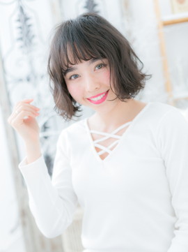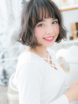 前下がりで小顔にメイクしているので、ボブ初挑戦の方にもオススメ。斜めバングや厚めバングで目力UPしたり、無造作質感の切りっぱなしボブもラブカジュアル。耳かけも大人かわいい。パーマで簡単スタイリングが嬉しい。オーガニックカラーは白髪にも対応可。