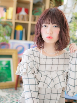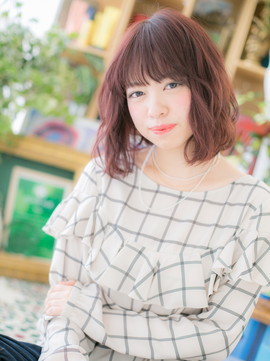 レッド系ピンク系カラーでガーリーに仕上げたくせ毛風ふわミディ。透け感ある斜めバングや厚めバングで目元を印象つけたり,耳かけも大人かわいい♪(bliss北浦和店アシスタント棟方の撮影スタイルです。メイク担当:棟方)