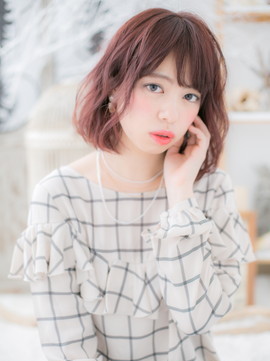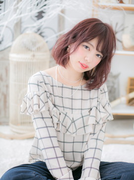 レッド系ピンク系カラーでガーリーに仕上げたくせ毛風ふわミディ。透け感ある斜めバングや厚めバングで目元を印象つけたり,耳かけも大人かわいい♪(bliss北浦和店アシスタント棟方の撮影スタイルです。メイク担当:棟方)